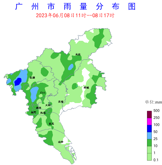 受北部灣季風低壓影響,6月8日11時至17時,我市西部及東北部地區(qū)出現(xiàn)了中到大雨、局部暴雨,并伴有6-8級大風和雷電。全市共有413個站點(88.1%)出現(xiàn)降雨,平均雨量9.1毫米,其中2個站點(0.4%)雨量在50~100毫米之間,25個站點(5.3%)雨量在25~50毫米之間。各區(qū)平均雨量(單位:毫米):越秀區(qū)19.6,荔灣區(qū)16.1,白云區(qū)16.1,花都區(qū)15.8,海珠區(qū)13.8,從化區(qū)8.2,番禺區(qū)7.7,天河區(qū)7.6,南沙區(qū)5.1,增城區(qū)4.8,黃埔區(qū)4.1,其中花都區(qū)赤坭鎮(zhèn)錄得全市最大累積雨量60.9毫米。期間,全市共有50個站點(10.7%)錄得6級以上陣風,其中1個站點(0.2%)錄得8級陣風,49個站點(10.4%)錄得6~7級陣風,越秀區(qū)梅花村錄得全市最大瞬時大風17.9米/秒(8級)。