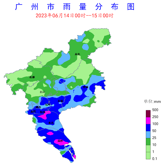受高空波動和季風低壓影響,6月14日我市中南部地區(qū)出現(xiàn)了暴雨、局部大暴雨,并伴有6-7級大風和雷電,雨勢較強時段為5-8時和13-18時。全市共有445個站點(94.9%)出現(xiàn)降雨,平均雨量42.4毫米,其中29個站點(6.2%)雨量在100~250毫米之間,138個站點(29.4%)雨量在50~100毫米之間,92個站點(19.6%)雨量在25~50毫米之間。各區(qū)平均雨量(單位:毫米):海珠區(qū)89.1,南沙區(qū)74.5,天河區(qū)72.6,番禺區(qū)62.7,黃埔區(qū)53.2,越秀區(qū)52.1,荔灣區(qū)47.2,增城區(qū)34,白云區(qū)19,從化區(qū)14.1,花都區(qū)11,其中南沙區(qū)南沙街錄得全市最大累積雨量165.1毫米。期間,全市共有39個站點(8.3%)錄得6~7級,番禺區(qū)南村鎮(zhèn)錄得全市最大陣風16.7米/秒(7級)。